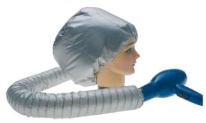 Alla base un raccordo tubolare realizzato con lo stesso materiale si fissa alla bocchetta del phon. L’aria calda prodotta dal phon viene veicolata nell’intercapedine della cuffia ed esce in modo uniforme attraverso i fori interni, riscaldando piacevolmente e in modo uniforme: sarà come asciugarsi sotto ad un casco.