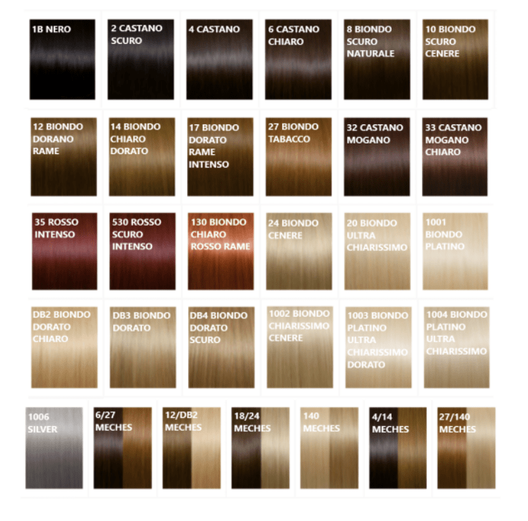 1B, 2 Castano Scuro, 4 Castano, 6 Castano Chiaro, 8 Biondo Scuro, 10, 12, 14, 17, 27 Biondo Tabacco, 32 Castano Mogano, 33 Castano Chiaro Mogano, 35 Rosso Intenso, 530, 130, 140 Ultra Biondo Dorato, 24, 20 Biondo Ultra Chiarissimo, DB2, DB3, DB4 Dorato Biondo Scuro, 1001, 1002, 1003, 1004, Argento SILVER (1006), Meches 4/14, Meches 6/27, Meches 18/24, Meches 12/DB2 2002VN50, Meches 27/140, Meches 140, Pink 68 crazy colours