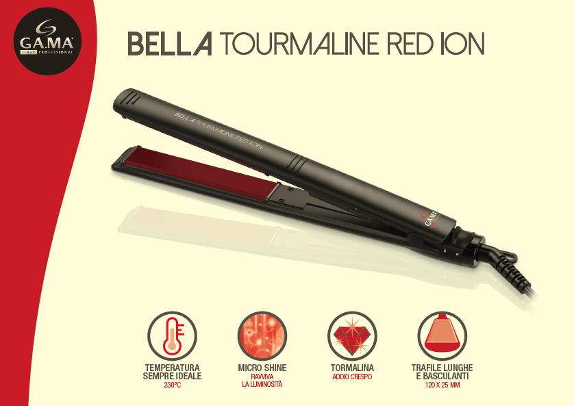 - BELLA TOURMALINE RED ION è la piastra che, grazie al rivestimento delle trafile in MICRO SHINE, dona splendore ai capelli