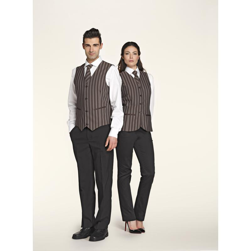 Il gilet Ho.Re.Ca. Miguel ha una vestibilità Slim Fit. Realizzato in poliviscosa elasticizzata e stabilizzata, presenta una mano morbidissima, resistente alle medie temperature. Disponibile in una fantasia scozzese dall’aspetto sobrio che spazia tra diverse tonalità di blu e di marrone, ha un retro a contrasto in tessuto nero con grammatura leggera. Il risultato finale è un gilet da uomo con uno stile moderno ed eclettico, arricchito da accessori con finitura galvanica in ottone anticato.